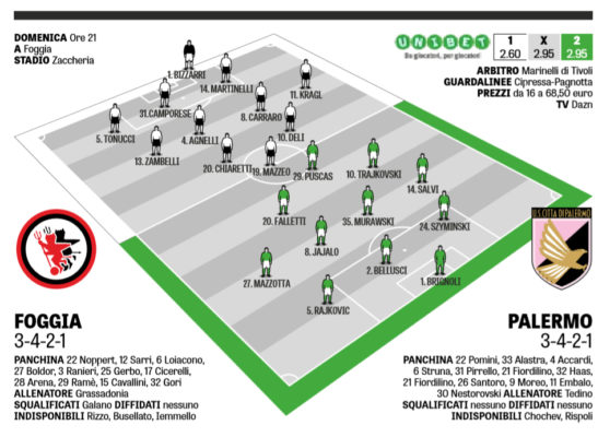 Foggia-Palermo, le probabili formazioni Simone Clara 14 Settembre 2018 L’edizione odierna della Gazzetta dello Sport ha stilato le probabili formazioni di Foggia-Palermo. Ecco le scelte di Grassadonia e Tedino: Senza Titolo 2 547×400