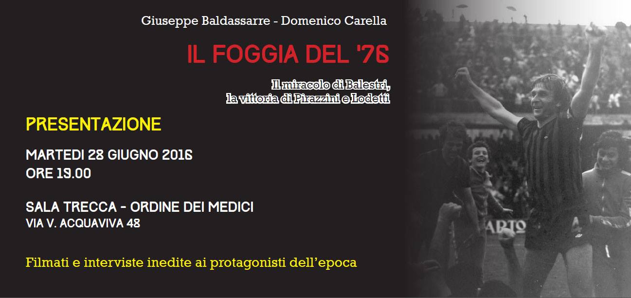 Questa sera, alle ore 19, presso la Sala Trecca dell’Ordine dei Medici in via Acquaviva 48 a Foggia si terrà la presentazione del volume “Il Foggia del ’76. Il miracolo di Balestri, la vittoria di Pirazzini e Lodetti“, scritto a quattro mani da Domenico Carella e Giuseppe Baldassarre. Il libro ripercorre la cavalcata dei rossoneri nella stagione 1975/76 culminata con la promozione in Serie A.