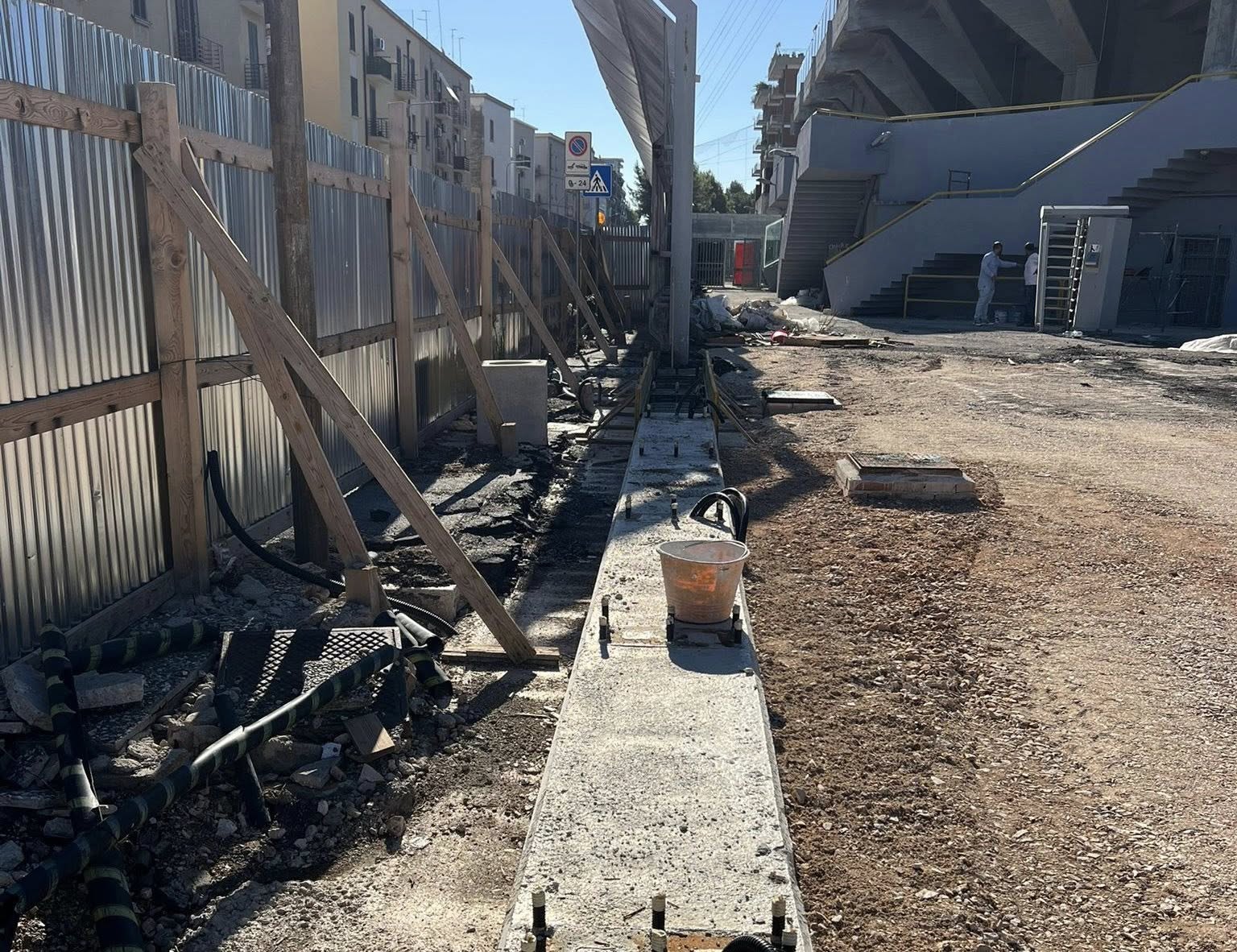 Nei giorni scorsi sono state completate tutte le opere di fondazione su cui verranno montate le nuove recinzione perimetrali, anch’esse in avanzato stato di produzione in officina per poi eseguirne il montaggio in loco. Nella prossima settimana si procederà con il getto della soletta in calcestruzzo armato del nuovo piazzale, quest’ultimo dimensionato per accogliere il pubblico ospite fino alla futura capienza di 1.500 spettatori, nonché parcheggiare in condizioni di massima sicurezza n. 5 autobus assicurando spazi idonei di salita/discesa e movimentazione dei tifosi.