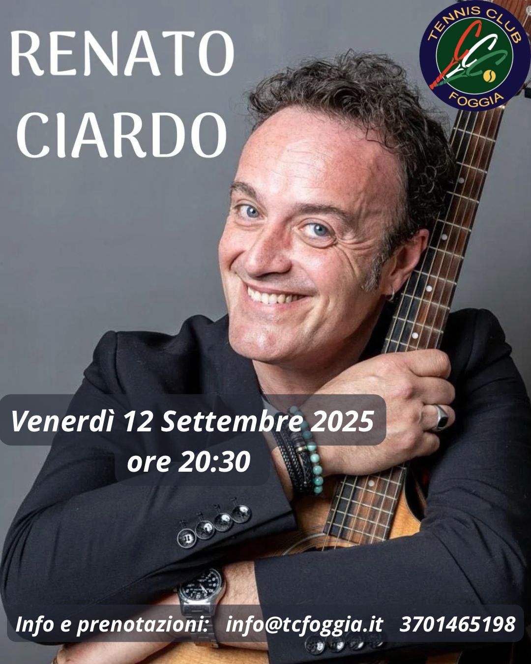 FOGGIA – Il 12 settembre, a partire dalle 20.30, il Tennis Club di Foggia organizza una serata imperdibile all’insegna del sorriso, della musica e della cultura locale: Renato Ciardo sarà protagonista con il suo spettacolo. Il comico, musicista e cabarettista barese porterà sul palco la sua ironia raffinata, i tormentoni che lo hanno reso celebre e una coinvolgente miscela di musica, aneddoti, ritmi retrò e dialetto autentico.