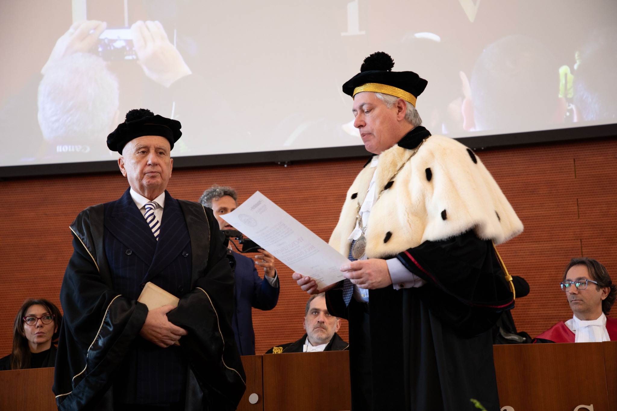 Il conferimento della laurea honoris causa è avvenuto secondo il tradizionale rito medievale: il Rettore ha posato sul capo del laureando il tocco, simbolo della funzione dottorale, pronunciando la solenne formula in latino. È seguita la consegna del Libro, prima chiuso, a simboleggiare il possesso della conoscenza, poi aperto, a rappresentare la sua divulgazione. La cerimonia si è conclusa con la consegna della pergamena di laurea.