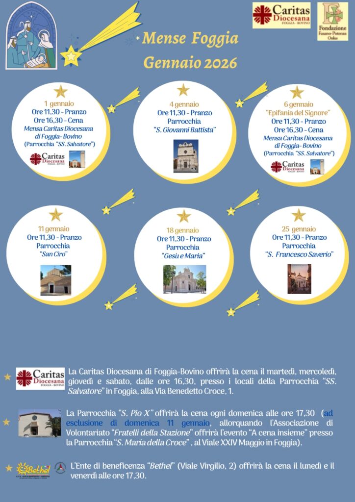FOGGIA – Anche nel mese di gennaio 2026 prosegue l’impegno della Caritas Diocesana Foggia-Bovino, in collaborazione con parrocchie e realtà del territorio, per garantire pasti caldi alle persone in difficoltà. Un servizio fondamentale che, come ogni anno, coinvolge diverse comunità parrocchiali della città.