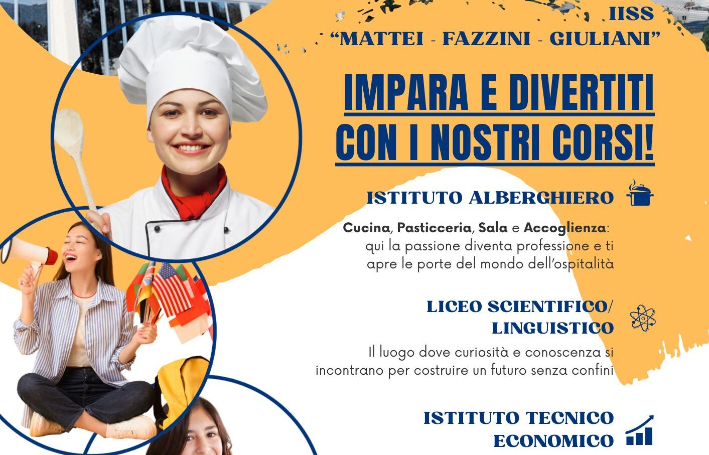 L’istituto offre indirizzi dell’area alberghiera nei settori Cucina, Pasticceria, Sala e Vendita e Accoglienza Turistica, pensati per formare figure qualificate nel campo dell’ospitalità, della ristorazione e del turismo, ambiti strategici per il territorio e per il mercato del lavoro. Accanto a questi, l’offerta formativa si arricchisce dei percorsi liceali Scientifico e Linguistico, oltre all’indirizzo ITE – Amministrazione, Finanza e Marketing (AFM), garantendo così agli studenti la possibilità di scegliere un percorso coerente con i propri interessi e obiettivi futuri.