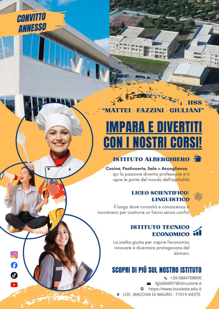 L’Istituto Alberghiero “Mattei” di Vieste rappresenta una realtà formativa di riferimento per il territorio, grazie a un’offerta didattica ampia e articolata, capace di rispondere alle diverse attitudini e aspirazioni degli studenti. I percorsi di studio proposti consentono di costruire competenze solide, unendo preparazione culturale, professionalizzazione e attenzione alla crescita personale.