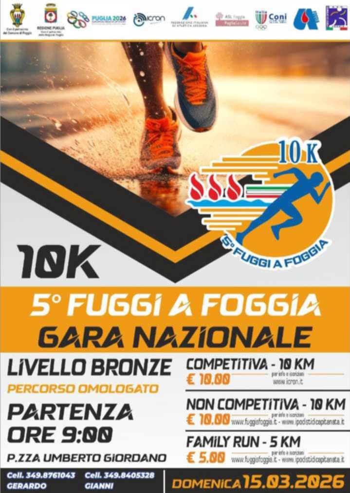 La disciplina sportiva del running è sempre più diffusa, ad ogni età. Foggia sarà protagonista di un evento nazionale di grande interesse per tutti gli appassionati di corsa. Domenica 15 marzo si svolgerà la quinta edizione di “Fuggi a Foggia”, con partenza alle ore 9.00 da Piazza Umberto Giordano.