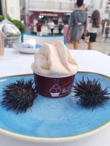 Il viaggio emozionante e gustoso tra le varie altitudini del Gargano parte dal mare, facendoci inebriare dal profuml della salsedine e perdere tra le onde dell’Adriatico, con un sorbetto ai ricci di mare. Ottimo per essere gustato a casa con una deliziosa burrata di Andria IGP, un filo d’olio d’oliva extravergine e foglioline rinfrescanti di menta che regalano un piacevole contrasto tra i sapori.