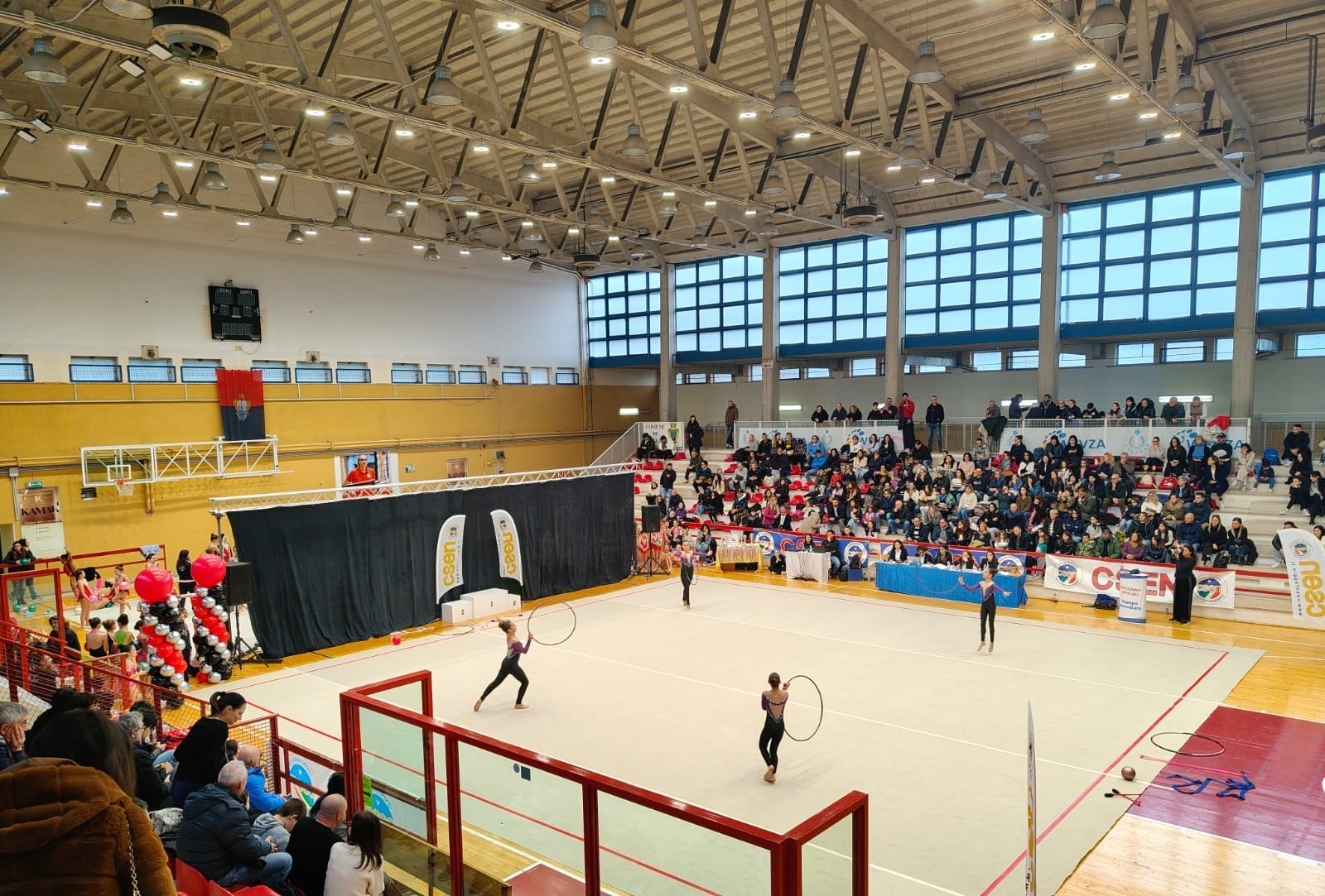 Dalle 9 alle 18 le atlete si sono esibite con esecuzioni impeccabili con cerchi, nastri e clavette, impreziosendo le coreografie con la precisione tecnica di altissimo livello.