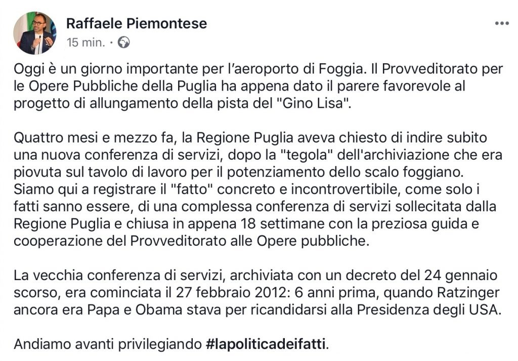 “Siamo qui a registrare il “fatto” concreto e incontrovertibile, come solo i fatti sanno essere, di una complessa conferenza di servizi sollecitata dalla Regione Puglia e chiusa in appena 18 settimane con la preziosa guida e cooperazione del Provveditorato alle Opere pubbliche. La vecchia conferenza di servizi, archiviata con un decreto del 24 gennaio scorso, era cominciata il 27 febbraio 2012: 6 anni prima, quando Ratzinger ancora era Papa e Obama stava per ricandidarsi alla Presidenza degli USA. Andiamo avanti privilegiando #lapoliticadeifatti”.