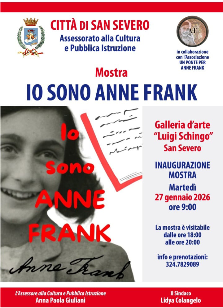 Da martedì 27 a sabato 31 gennaio 2026, presso la “Galleria Schingo” di San Severo sarà allestita la mostra con pannelli espositivi “Io sono Anna Frank”, in occasione della Giornata della Memoria, con apertura prevista alle ore 9:00 di martedì 27 gennaio.