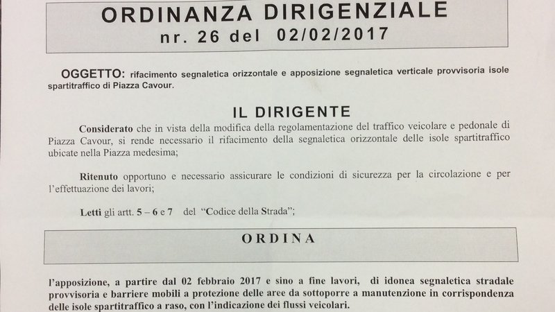 “Raccolta firme per chiedere al Sindaco di Foggia di revocare l’ ordinanza con la quale si istituiscono le isole spartitraffico in Piazza Cavour, in quanto luogo di interesse storico.”