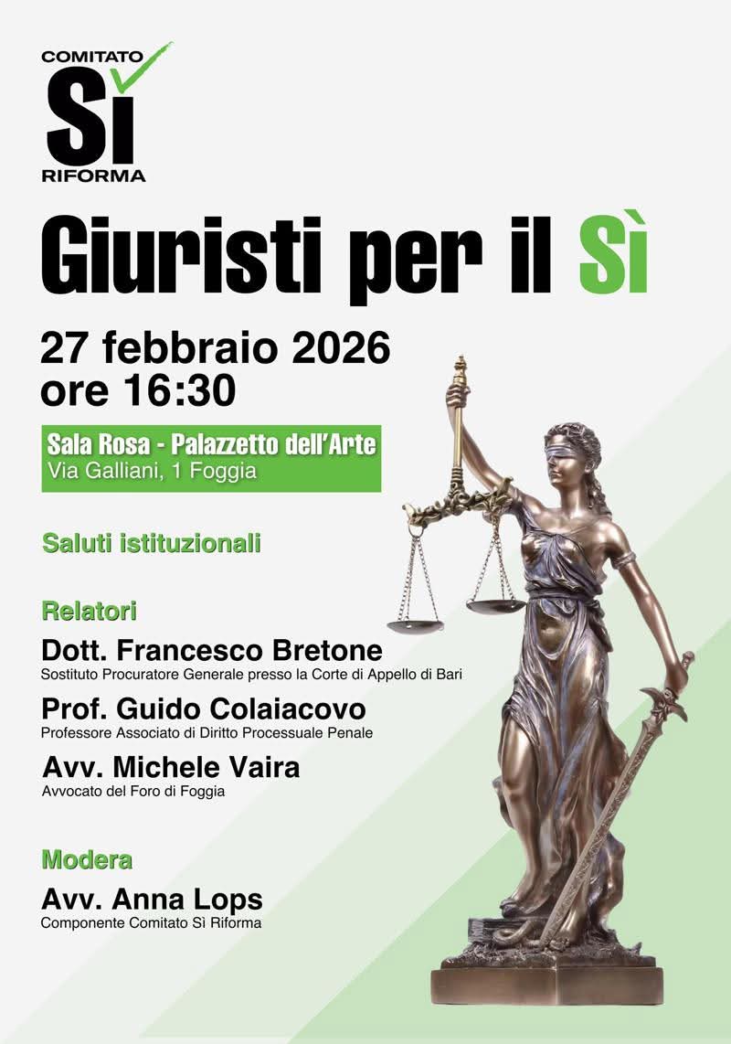 E’ in programma venerdì 27 Febbraio nella Sala Rosa del Palazzetto dell’Arte “Andrea Pazienza” (in via Galliani n. 1) alle ore 16.30 un incontro promosso e organizzato dal Comitato SiRiforma di Foggia, coordinato dall’ing. Raffaele Rosiello e composto da vari professionisti: il dott. Salvatore de Martino, l’avv. Anna Lops, il dott. Michele Spirito, il dott. Paolo Gramazio.