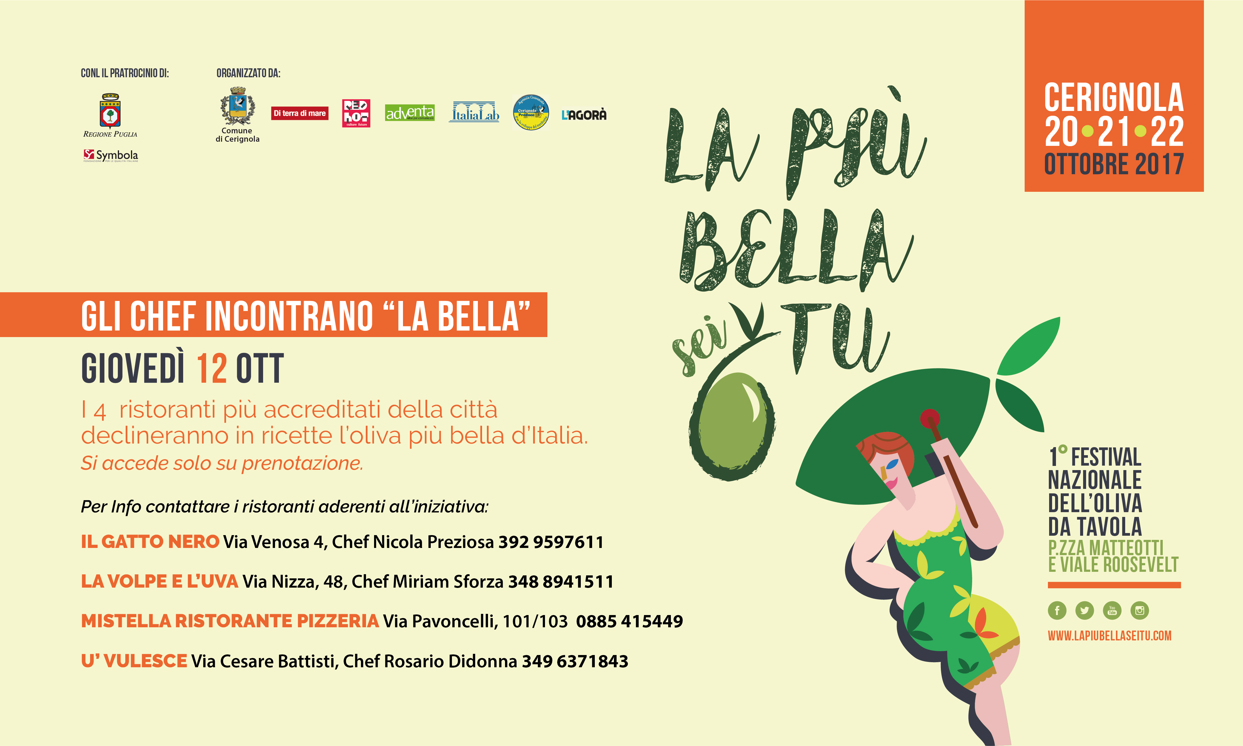“Gli chef incontrano la Bella” è l’appuntamento in programma giovedì 12 ottobre nei quattro ristoranti più accreditati di Cerignola per iniziare ad assaporare l’atmosfera de “La più bella sei tu”. In attesa del 1° Festival Nazionale dell’Oliva da tavola che si terrà dal 20 al 22 ottobre – promosso dal Comune di Cerignola e realizzato in collaborazione con l’associazione Di terra di mare, Red Hot – impresa creativa, Adventa, ItaliaLab, Cerignola Produce – agenzia comunale per lo Sviluppo del Territorio e L’Agorà – gli chef de Il gatto nero, La volpe e l’uva, Mistella e U' Vulesce, declineranno in ricetta l’oliva più Bella d’Italia. Ogni ristorante proporrà un menù in cui l’oliva Bella di Cerignola sarà l’ingrediente principale. Dal pane casereccio al pandolce fatti con le olive, passando per antipasti, primi e secondi piatti – sia di terra che di mare – dove l’oliva regnerà sovrana. Alla serata si accede solo su prenotazione, per info contattare i ristoranti aderenti all’iniziativa. Si ricorda, inoltre, che la mattina di giovedì 12 ottobre la 1^ edizione del festival “la più Bella sei tu” sarà presentata ad Agrilevante. L’appuntamento è alle ore 12.00 nella Sala Mia (Salone della Multifunzionalità) – Padiglione 20 della Fiera del Levante.