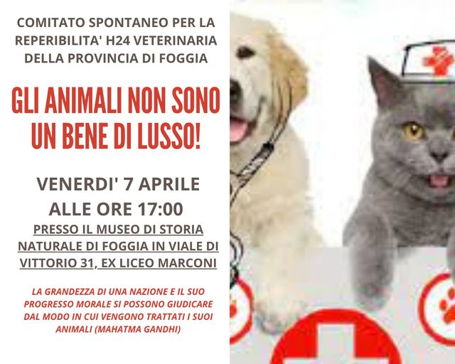 La questione della guardia medica veterinaria torna in primo piano. Dopo il no di Comune e Ordine dei Veterinari, è nato un comitato spontaneo per la reperibilità H24 veterinaria della provincia di Foggia. “Sulla questione della reperibilità H24 dei veterinari non vogliamo far calare il silenzio – scrive Fabrizio Cangelli referente provinciale di Europa Verde Foggia -Per questo insieme a La Società Civile – Foggia, WWF Foggia ed a tutte le associazioni animaliste che hanno portato il loro prezioso contributo, abbiamo deciso di aderire a questo Comitato Spontaneo ed organizzare l’iniziativa di venerdì 7 aprile alle 17 presso il Museo di Storia Naturale di Foggia”.