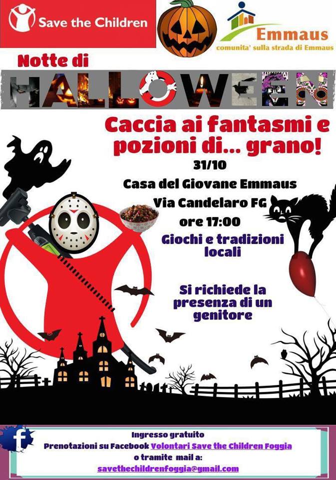Il gruppo volontari Save The Children Foggia, in collaborazione con la Casa del Giovane Emmaus, vi invita a festeggiare in modo alternativo la tanto attesa festa di Halloween! Vogliamo dare ai bambini foggiani la possibilità di trascorrere alcune ore con noi, durante le quali uniremo giochi e divertimento a momenti di condivisione e apprezzamento delle tradizioni tipiche del nostro territorio. Durante il pomeriggio che passeremo insieme ci sarà spazio per dare sfogo alla propria creatività, attraverso la realizzazione delle tipiche mascherine di Halloween, ma non solo!
