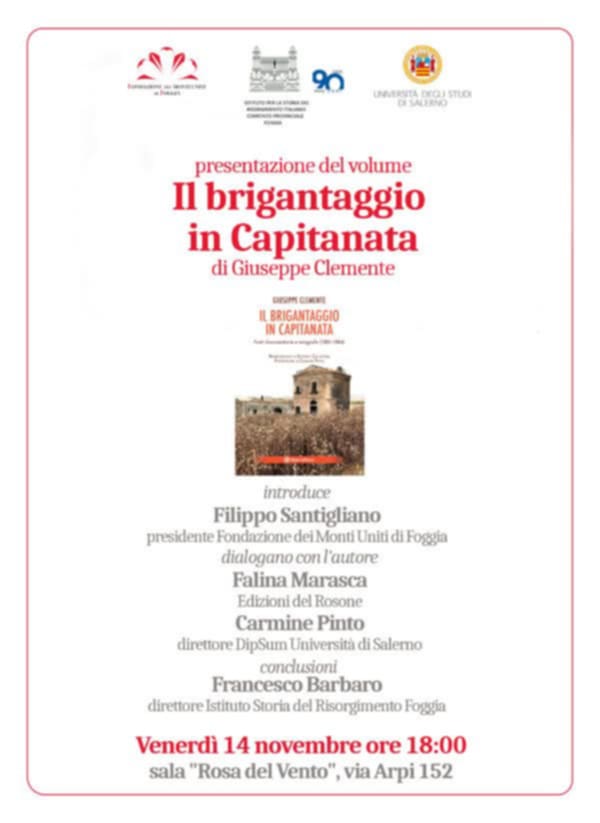 Venerdì 14 novembre 2025, alle ore 18, nella sala “Rosa del Vento” della sede della Fondazione dei Monti Uniti di Foggia (via Arpi 152), si terrà la presentazione del volume di Giuseppe Clemente, “Il brigantaggio in Capitanata. Fonti documentarie e anagrafiche (1861-1864)”, recentemente ristampato a seguito del grande interesse riscosso.