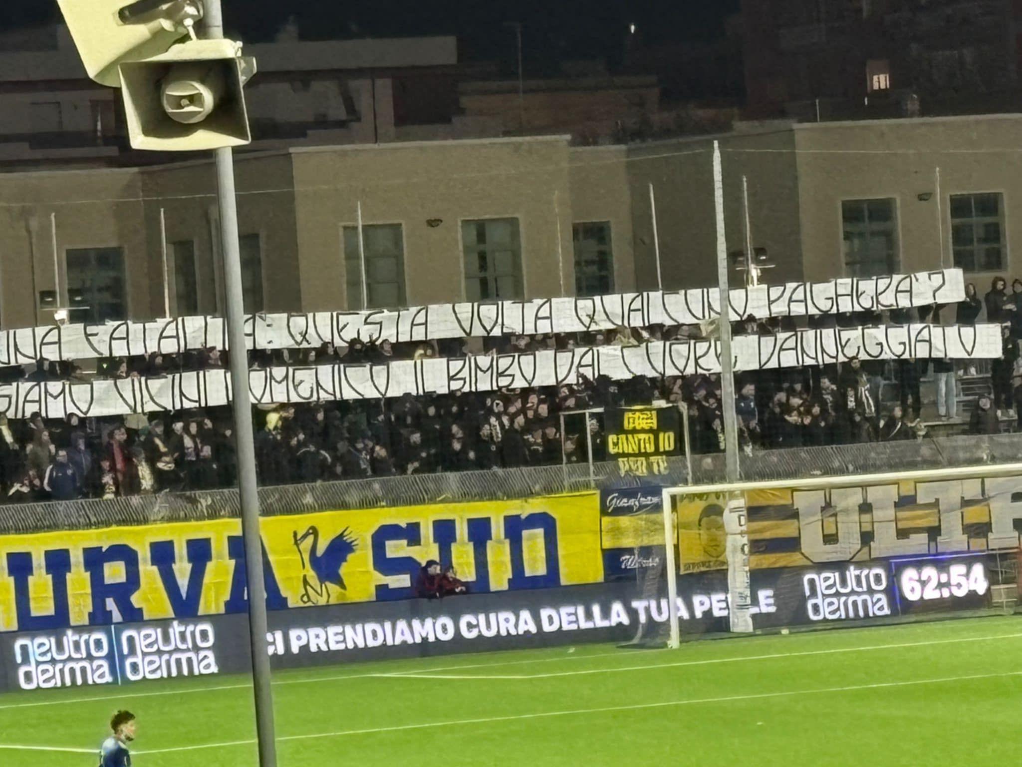 Ancora una volta la Curva Sud sensibilizza i presenti su un tema importante: lo striscione del Club Ultras è interamente dedicato al piccolo Domenico dal cuore danneggiato.