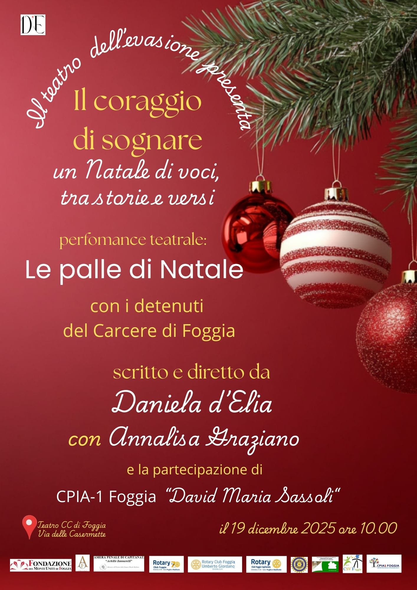 Lo spettacolo, scritto e diretto da Daniela d’Elia con la collaborazione di Annalisa Graziano, nasce all’interno del progetto “Voci libere per il teatro dell’evasione”, uno spazio di espressione, ascolto e rielaborazione emotiva. Un racconto corale che intreccia parole, vissuti e poesia, restituendo al Natale il suo significato più autentico: quello della possibilità, del cambiamento e della speranza.