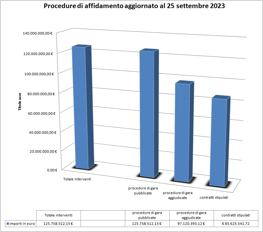 Al 25 settembre di quest’anno la somma degli interventi progettati raggiunge la cifra di oltre 125 milioni di euro e tutte le relative gare risultano già pubblicate. Di queste, circa 97milioni di euro sono da riferirsi a gare già aggiudicate e più di 85 milioni di euro sono quelli relativi a contratti già stipulati.