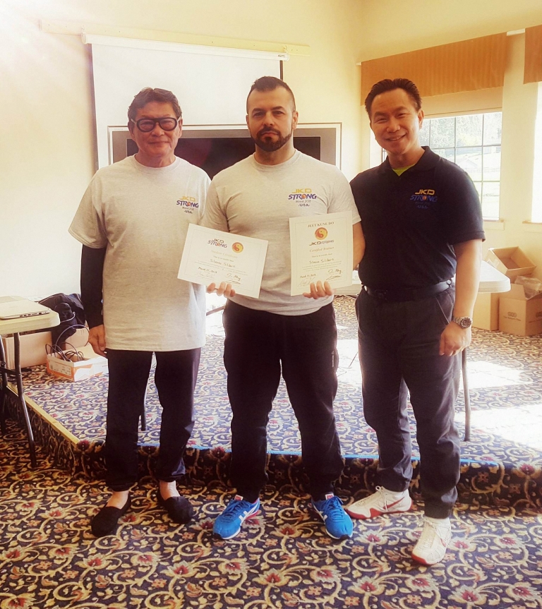 R: «Cedere? A uno stage unico e così importante? Mai! Ironia a parte, durante le lezioni eravamo seguiti da esperti in particolare della comunicazione, che hanno messo a dura prova il nostro metodo d’insegnamento, vagliando le nostre capacità in aula. Insomma un vero Master in Jeet Kune Do, che ha prodotto istruttori di seconda generazione, discendenti di Bruce Lee nella pratica sportiva e i suoi insegnamenti. Posso dire con soddisfazione, e sano orgoglio, che il master ci ha fatto conseguire un lineage invidiabile, che innalza la qualità del jkd in Europa, fornendo linee guida che noi allievi di Peter Chin e Tommy Gong possiamo dare a tutti gli istruttori del settore. Insomma, abbiamo un pedigree invidiabile talmente prezioso quanto utile per chi vorrà apprendere il vero jkd, non quello scopiazzato e “insegnato” in alcune palestre».