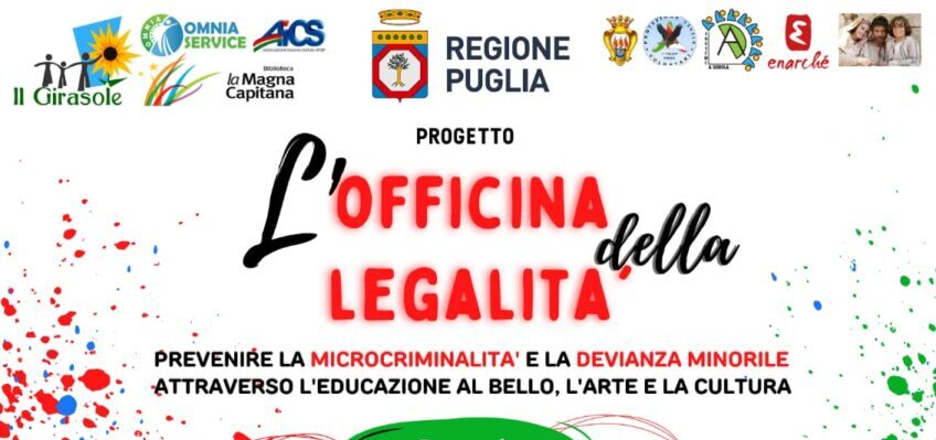 FOGGIA – Prevenire e contrastare forme di microcriminalità e devianza minorile attraverso l’educazione al Bello, l’Arte e la Cultura. Sono gli obiettivi del progetto “L’Officina della Legalità” promosso dall’associazione Il Girasole di Foggia, da diversi anni ormai impegnata a Foggia con tante attività per bimbi e ragazzi con autismo e difficoltà cognitive, finanziato dalla Regione Puglia a seguito del bando “Bellezza e Legalità”. Diversi i partner del progetto: l’istituto Dante Alighieri di Foggia, la comunità dell’istituto San Giuseppe di Foggia, Omnia Service, AICS Foggia, la Biblioteca “La Magna Capitana” di Foggia, Comune di Foggia, associazione di Volontariato e Protezione Civile “I Falchi” di Foggia, la compagnia teatrale Enarchè.