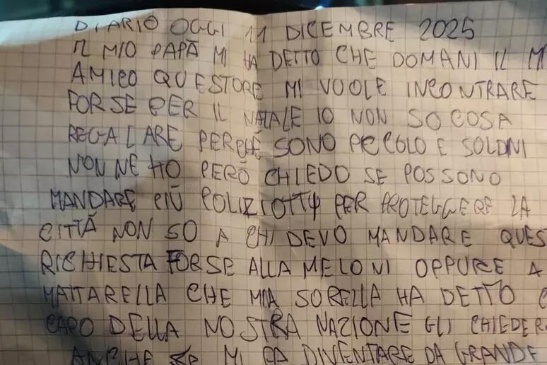 «Sono piccolo e soldi non ne ho – scrive – però chiedo se possono mandare più poliziotti per proteggere la città». Nella lettera, il bambino si rivolge persino alla presidente del Consiglio e al Presidente della Repubblica, citati con l’ingenuità e la sincerità tipiche della sua età. E aggiunge un sogno: «Da grande vorrei diventare un poliziotto oppure un carabiniere».
