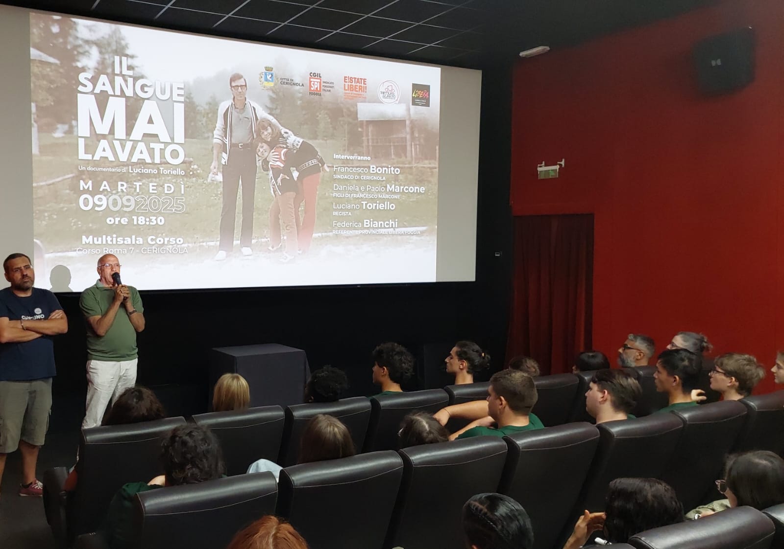 L’incontro si è svolto presso il Multisala Corso di Cerignola, ed è stato arricchito dagli interventi di Francesco Bonito, Sindaco di Cerignola; Paolo e Daniela Marcone, figli di Francesco Marcone; Luciano Toriello, regista; Federica Bianchi, referente del Coordinamento Provinciale di Libera Foggia.