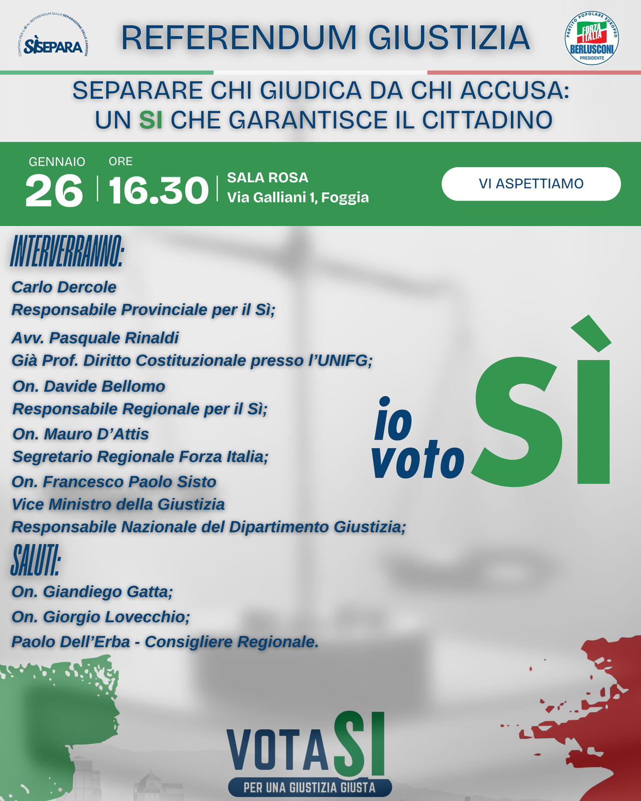 “Separare chi giudica da chi accusa: un SI che garantisce il cittadino” è il tema dell’incontro in programma lunedì 26 gennaio alle ore 16.30 presso la sala Rosa del Palazzetto dell’Arte di Foggia, quale primo appuntamento del ciclo di eventi che Forza Italia organizzerà in vista del Referendum confermativo sulla Giustizia in programma il 22 e 23 marzo.