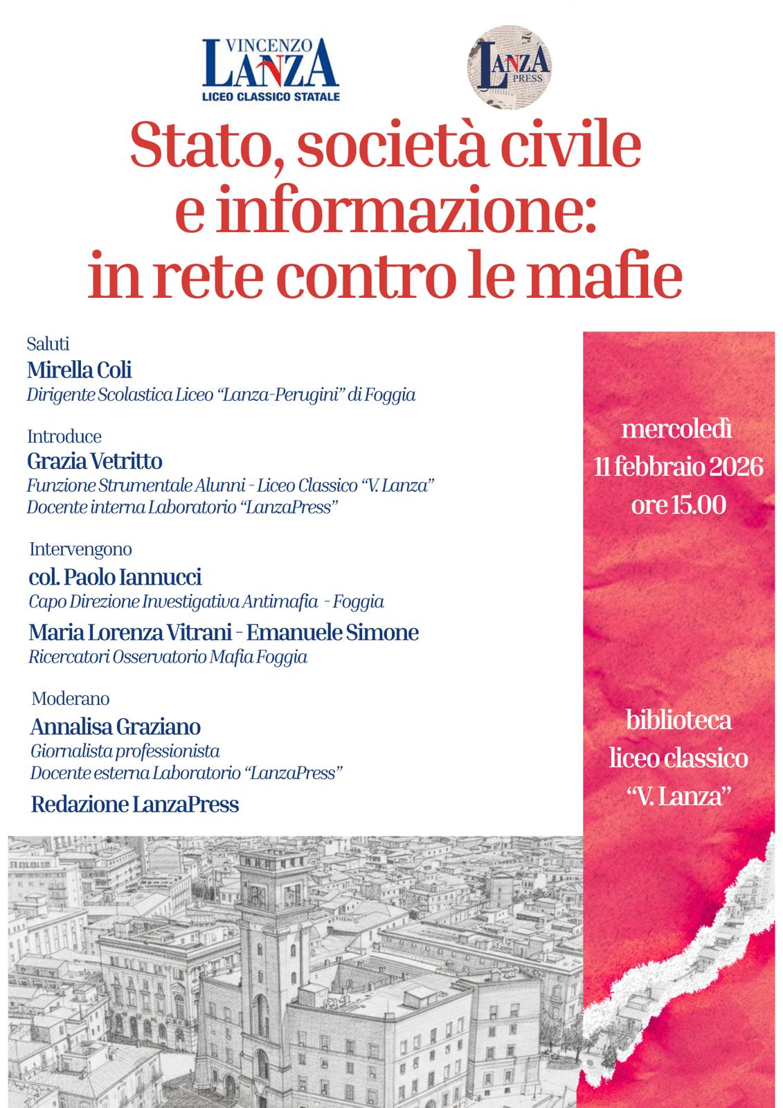 Mercoledì 11 febbraio 2026, alle ore 15.00, nella biblioteca del Liceo classico “V. Lanza” di Foggia, si terrà l’incontro “Stato, società civile e informazione: in rete contro le mafie”, un appuntamento di approfondimento e confronto dedicato al ruolo delle istituzioni, della società civile e dell’informazione nella lotta ai fenomeni mafiosi, con un’attenzione particolare al valore educativo della conoscenza e della partecipazione consapevole.