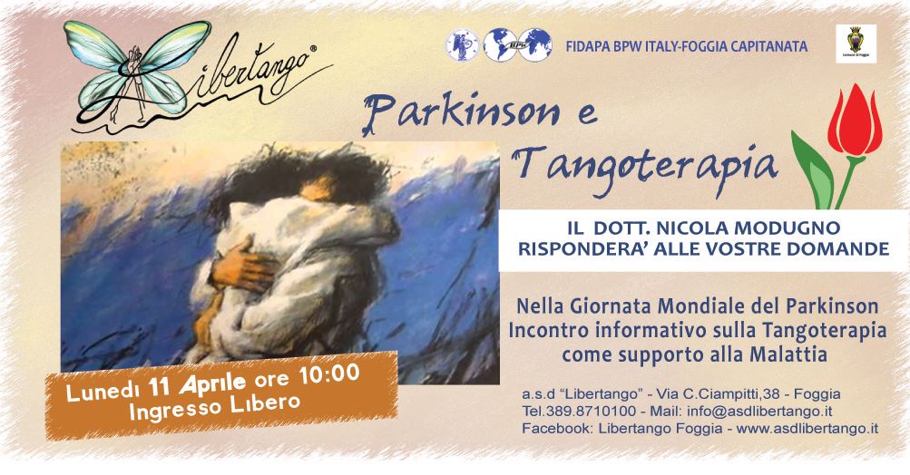 Lunedì 11 Aprile, l’Associazione Sportiva Dilettantistica “Libertango” presieduta da Antonella Salerno, in occasione della Giornata Mondiale del Parkinson organizza un incontro informativo, totalmente gratuito ed aperto a tutta la cittadinanza, con lo scopo di sensibilizzare il pubblico sulla Malattia di Parkinson e metterlo a conoscenza di “terapie complementari” come la tangoterapia.