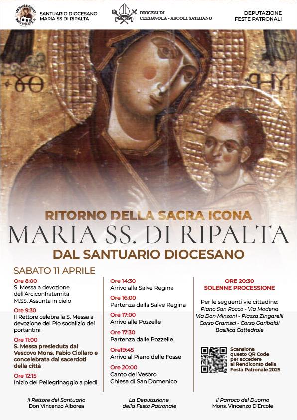 Alle ore 20.30 si svolgerà la solenne processione della Sacra Effige della Madonna di Ripalta per le seguenti vie cittadine: Piano San Rocco, Via Modena, Via Don Minzoni, Piazza Zingarelli, Corso Gramsci, Corso Garibaldi, Basilica Cattedrale (Duomo).