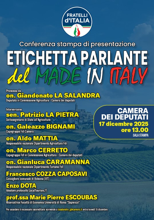 Portare i territori al centro delle politiche nazionali, partendo dalle eccellenze locali. È questo il senso politico e culturale della conferenza stampa di presentazione dell’“Etichetta Parlante del Made in Italy”, in programma mercoledì 17 dicembre presso la Sala Stampa della Camera dei deputati, su iniziativa del deputato foggiano Giandonato La Salandra.