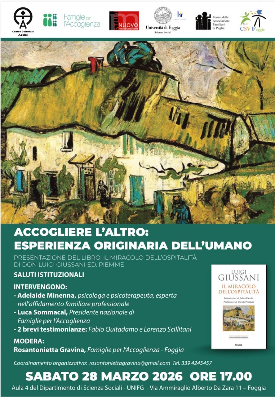 L’incontro, dal titolo “Accogliere l’altro: esperienza originaria dell’umano”, è promosso da Centro Culturale Archè, Famiglie per l’Accoglienza, associazione Nuovo Meridionalismo, Università di Foggia – Dipartimento di Scienze Sociali, Forum delle Associazioni Familiari di Puglia e CSV Foggia.