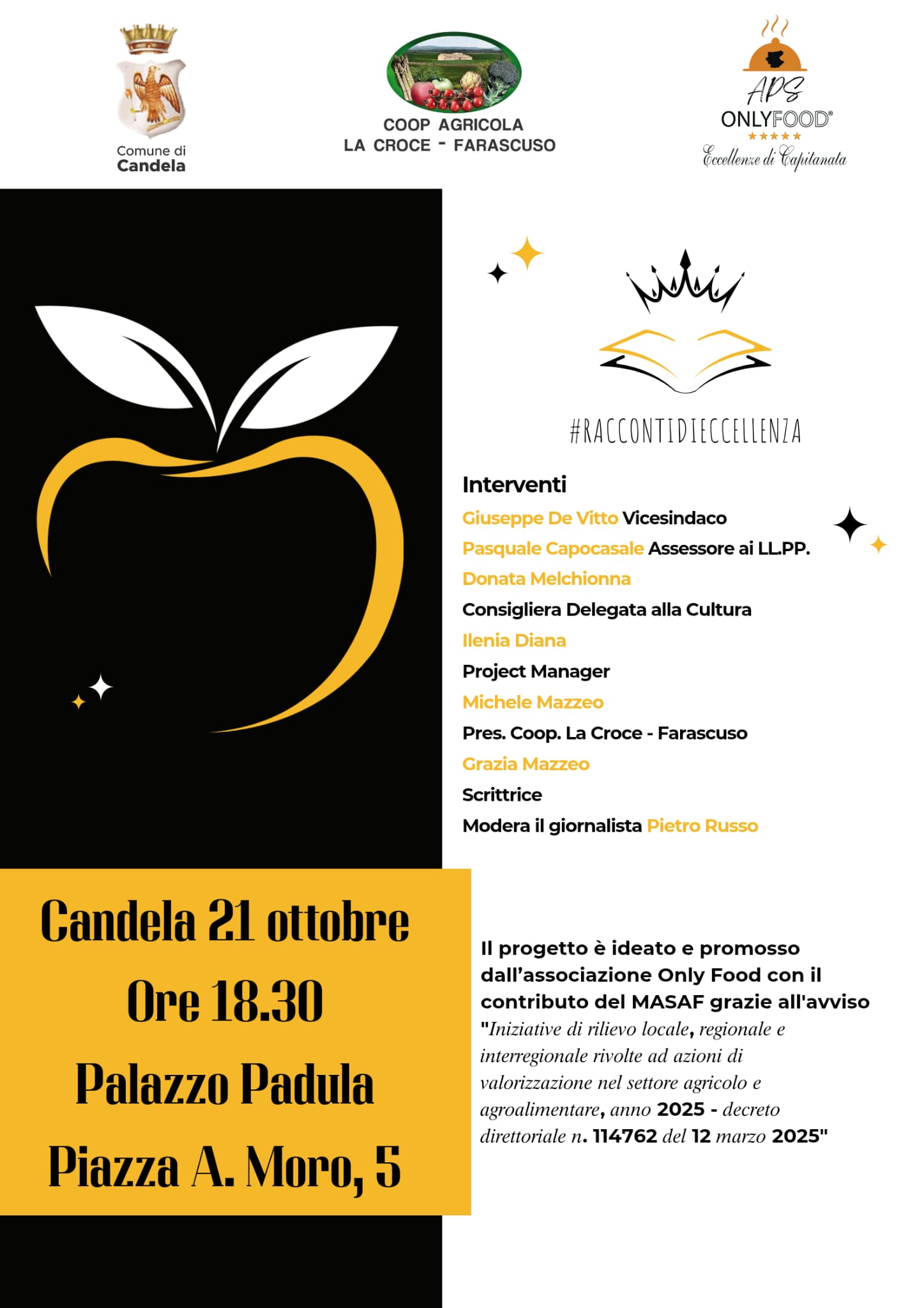 Saranno le mele di Candela le protagoniste assolute dei Racconti d’Eccellenza, il festival itinerante delle specialità agroalimentari della provincia di Foggia ideato e promosso dall’associazione OnlyFood con il contributo del MASAF.