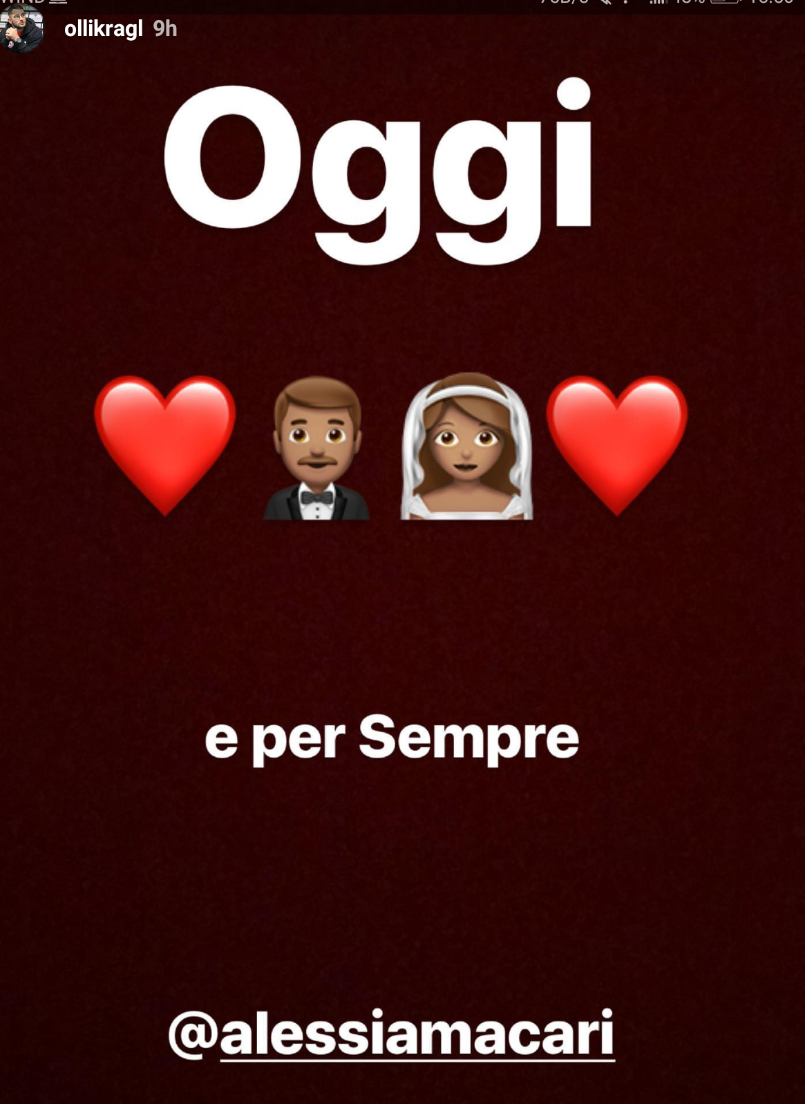 Inizia con un romantico stato su Instagram il giorno del matrimonio di Alessia Macari e Oliver Kragl. Proprio su Instagram infatti cominciò la loro storia d’amore, destinata a sfociare subito in un fidanzamento e poi in una convivenza con il trasferimento del bomber al Foggia Calcio, neo promosso in serie B.