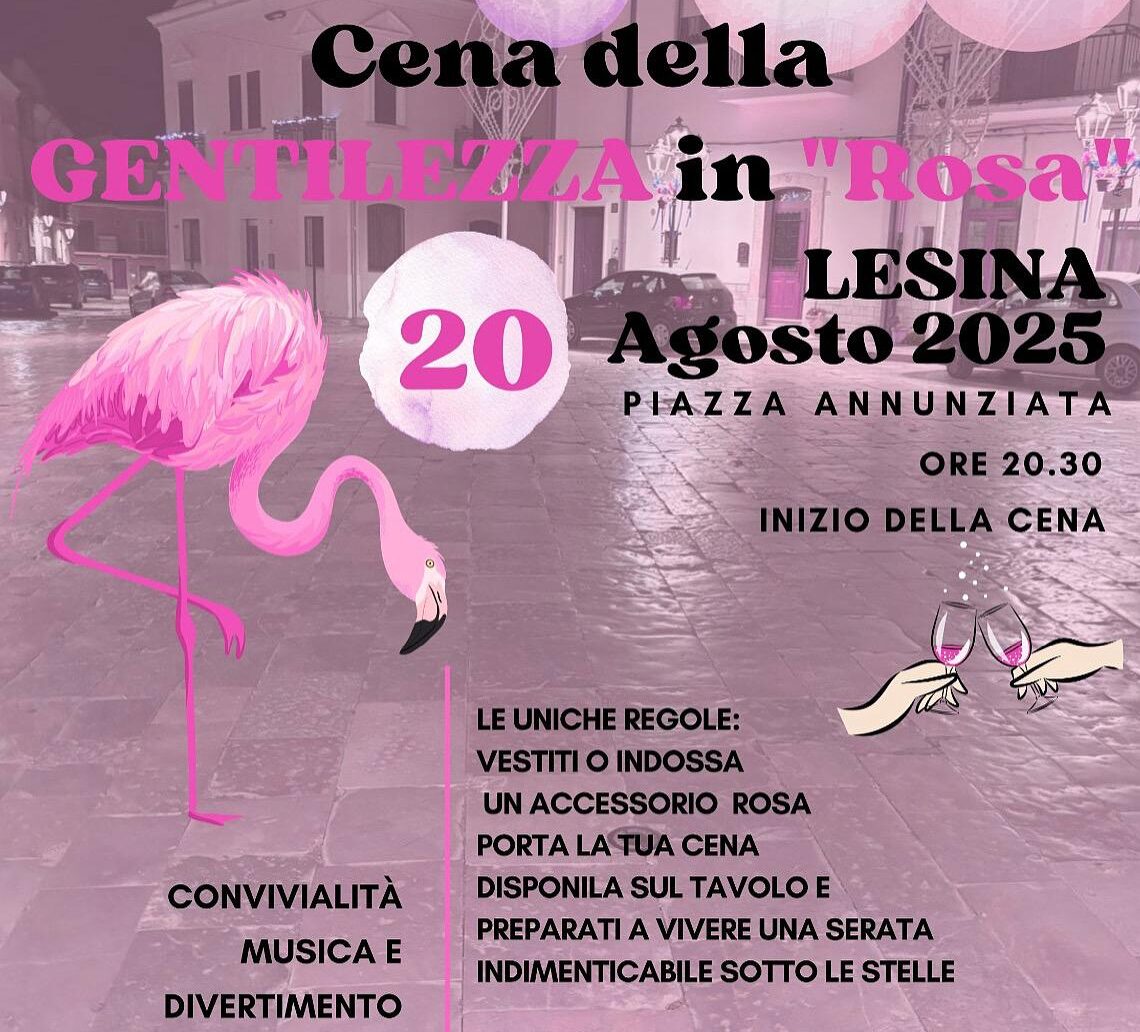 LESINA – Lesina si prepara a vivere una serata speciale all’insegna della gentilezza, della solidarietà, della convivialità e della promozione del territorio con la prima edizione della Cena della Gentilezza in Rosa, un’iniziativa nata dal cuore dell’associazione Voci di Donne di Lesina, giovane ma già fortemente radicata e attiva sul territorio, con appena due mesi e mezzo di vita e numerose iniziative già all’attivo. L’iniziativa si svolgerà mercoledì 20 agosto, alle ore 20:30, in Piazza Annunziata.