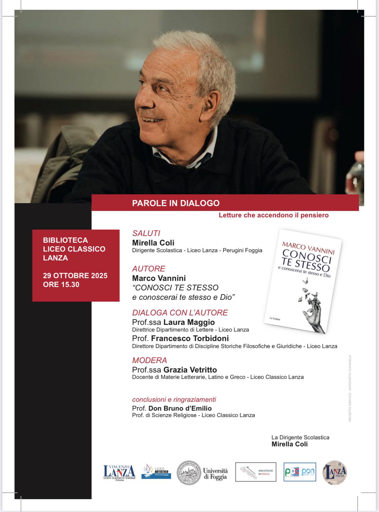 Mercoledì 29 ottobre 2025, alle ore 15.30, presso la biblioteca del Liceo Classico “V. Lanza” di Foggia, si terrà il primo appuntamento del ciclo “Parole in dialogo. Letture che accendono il pensiero”, con la presentazione del volume di Marco Vannini “Conosci te stesso e conoscerai te stesso e Dio” (Le Lettere).