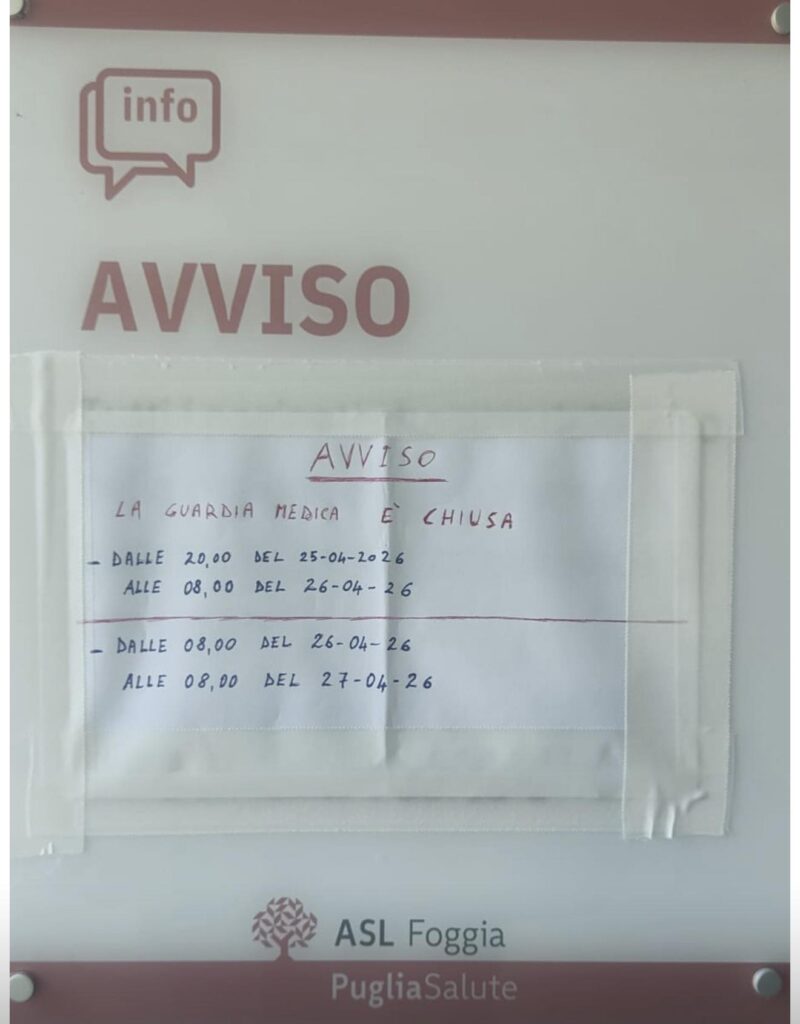 Negli ultimi due giorni la Guardia Medica situata al piano terra dell’ospedale Lastaria di Lucera è rimasta chiusa, con un semplice foglio affisso sulla porta a comunicare la sospensione del servizio. Una modalità che ha suscitato indignazione tra i cittadini, soprattutto per l’assenza di indicazioni alternative a cui rivolgersi.