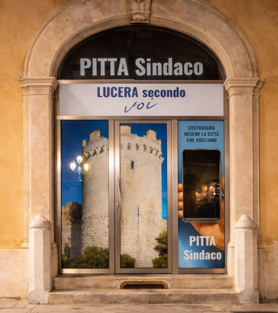 Invero, sulla porta d’ingresso risalta quello che dovrebbe essere lo slogan cardine del suo velleitario progetto politico alla ricerca della seconda sindacatura: «Lucera secondo voi». Una sorta di terza declinazione di un claim già noto, nato come «Lucera secondo me» e successivamente mutato in «Lucera secondo noi», che ha accompagnato il percorso iniziale — rispettivamente nella fase di ascolto individuale della comunità e in quella successiva di lavoro collettivo di co-progettazione — verso la candidatura di Lucera a Capitale italiana della Cultura 2026. Un percorso che si è poi concluso con la proclamazione della città a Capitale della Cultura di Puglia 2025 poiché unico Comune del tacco dello Stivale candidato alla competizione nazionale e capace di ritagliarsi un posto tra le dieci finaliste.