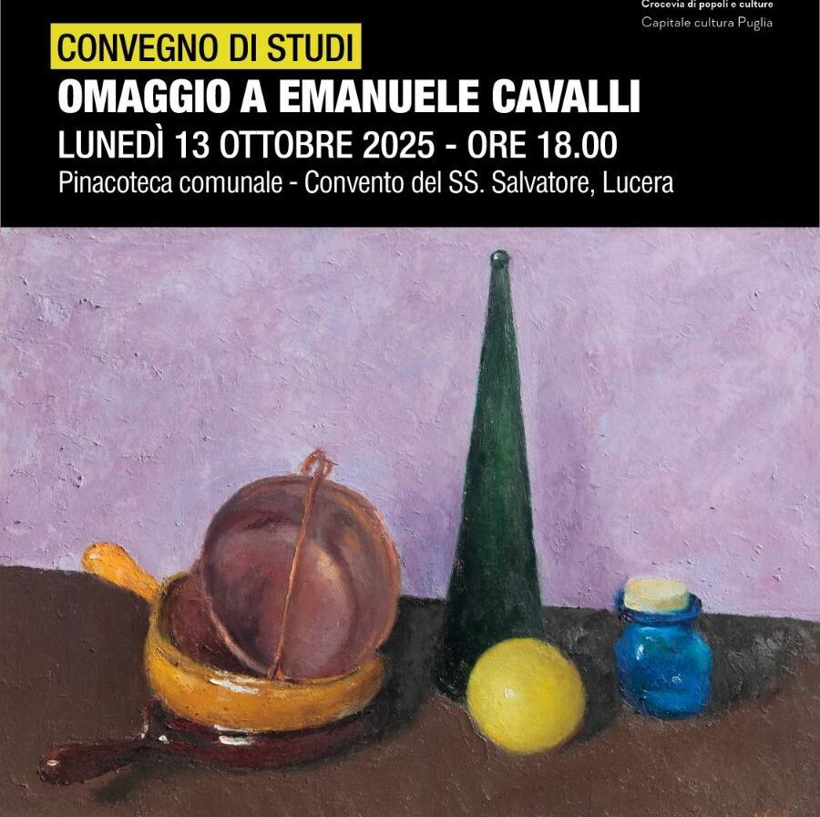 LUCERA – La città di Lucera celebra uno dei suoi artisti più illustri con il Convegno di Studi “Omaggio a Emanuele Cavalli”, in programma lunedì 13 ottobre alle ore 18.00 presso la Pinacoteca comunale del Convento del SS. Salvatore. L’iniziativa è promossa dal Comune di Lucera e dall’Associazione Emanuele Cavalli, nell’ambito del progetto “Lucera 2025 – Crocevia di popoli e culture. Capitale cultura Puglia”.