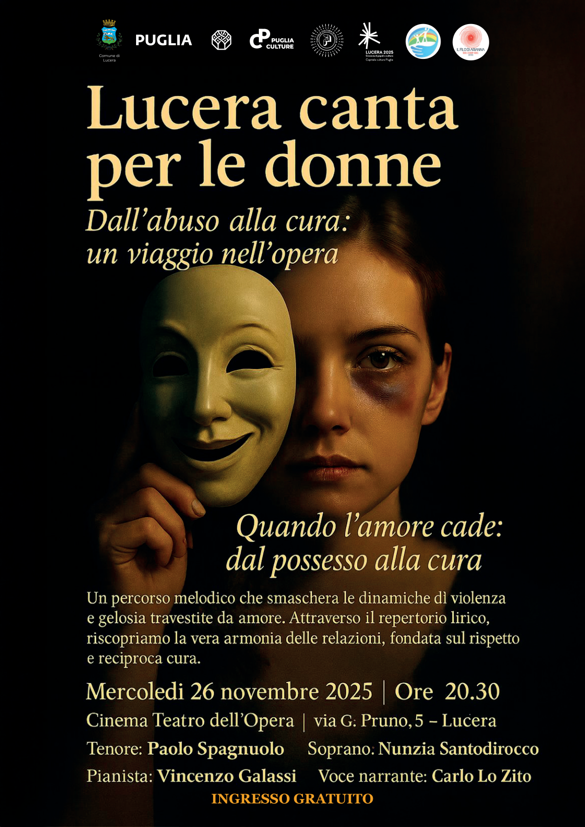 LUCERA – In occasione della Giornata internazionale per l’eliminazione della violenza contro le donne, il Comune di Lucera – in collaborazione con l’Ambito territoriale “Appennino Dauno Settentrionale”, il Centro Antiviolenza “Giovanna Tanese” e la cooperativa sociale “Il Filo di Arianna”, soggetto promotore – promuove per la serata di martedì 26 novembre un recital lirico dal forte valore simbolico e civile.