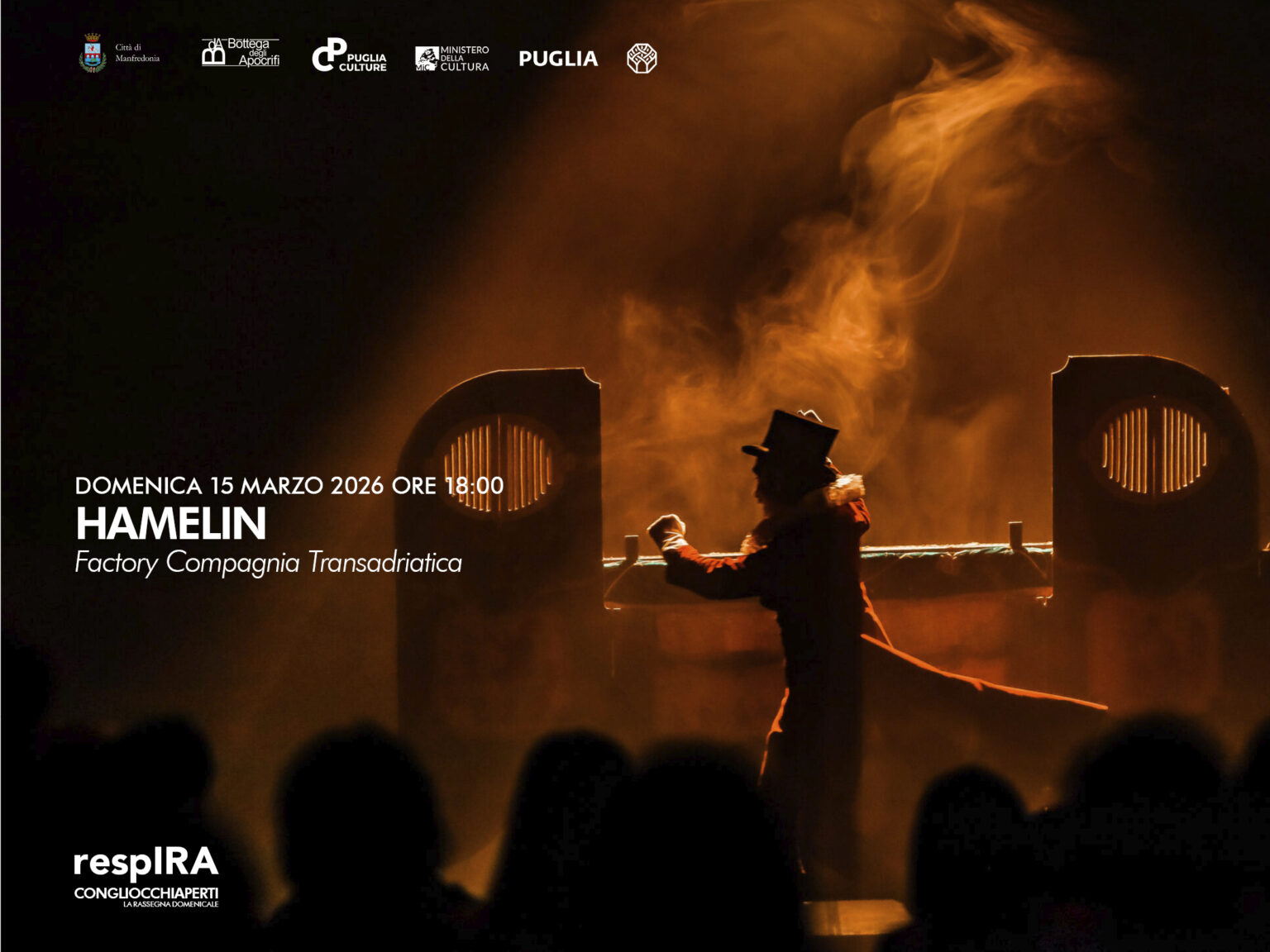 Domenica 15 marzo, alle ore 18.00, andrà in scena “Hamelin”, uno spettacolo di Factory Compagnia Transadriatica, per la regia di Tonio De Nitto e la drammaturgia di Riccardo Spagnulo, che prende spunto dall’enigma dei bambini scomparsi nella fiaba del Pifferaio Magico.