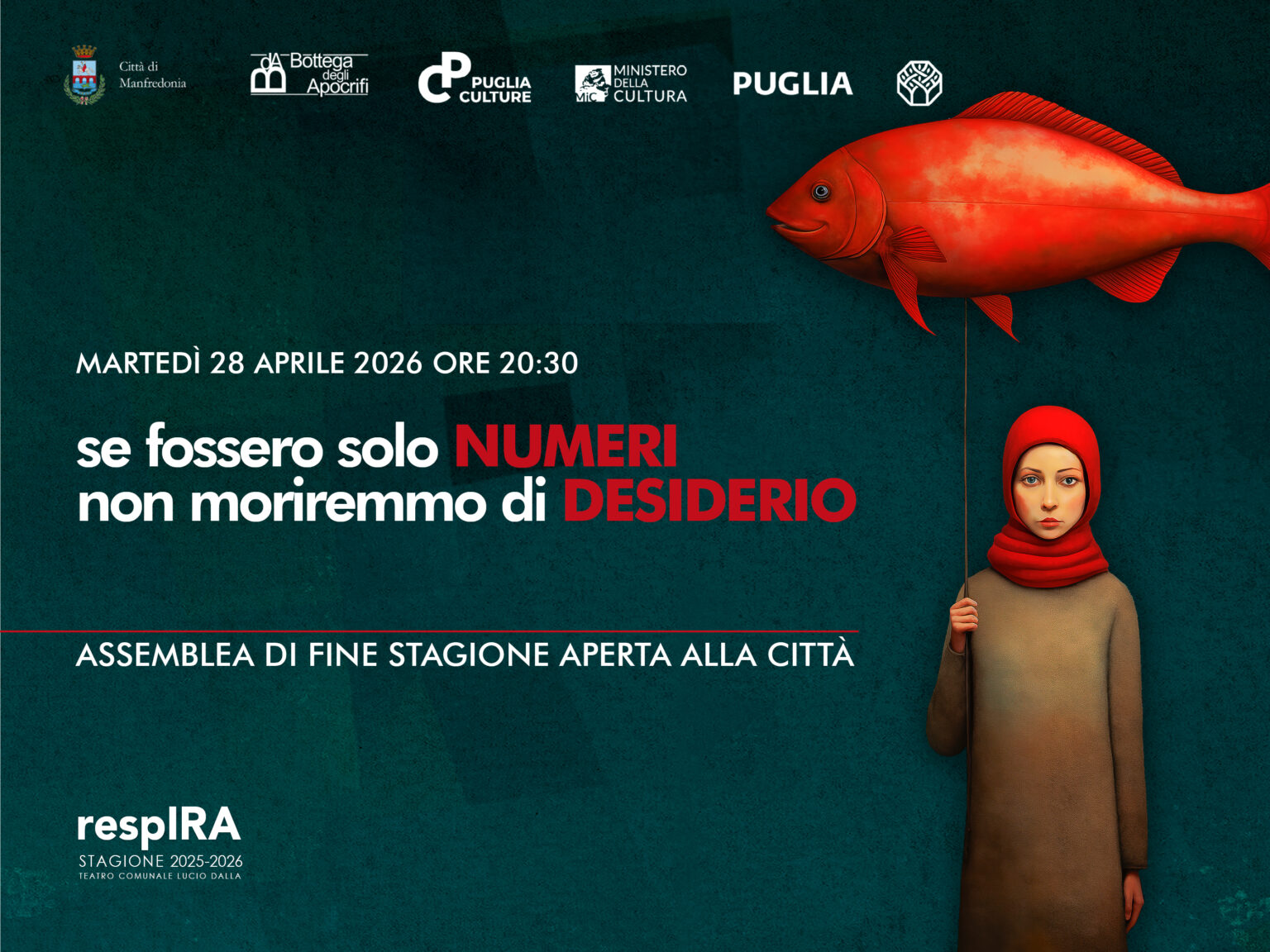 MANFREDONIA – Martedì 28 aprile 2026, alle ore 20.30, al Teatro Comunale “Lucio Dalla” di Manfredonia, la compagnia Bottega degli Apocrifi invita tutti coloro che hanno frequentato la stagione di prosa “respIRA” e l’intera cittadinanza a una discussione pubblica incentrata sui risultati di una stagione teatrale e sulle politiche culturali di un territorio.