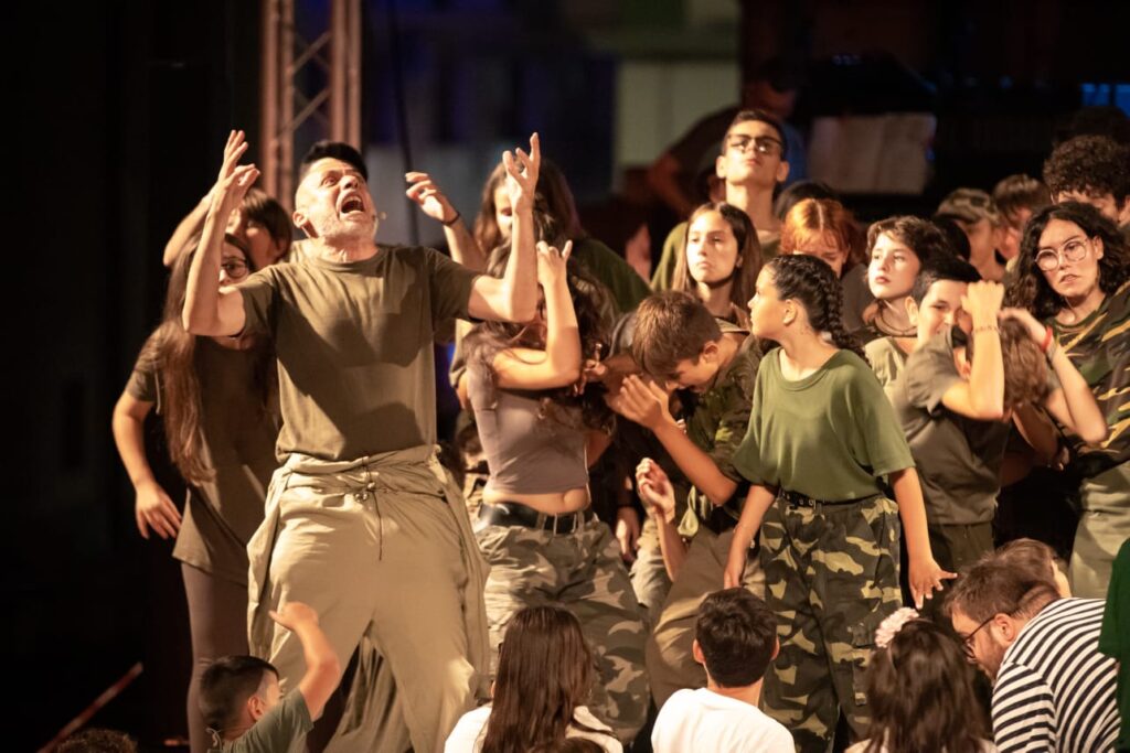 In questo tempo di guerra il testo “Pace”, scritto da un Aristofane poco più che ventenne, stanco della lunga guerra che devastava la sua città, arriva con forza esplosiva tra i nostri corpi e i nostri sguardi, e ci trascina con sé in uno spettacolo che vede in scena un grande coro di cittadini. Un rito collettivo di teatralità diffusa, dove gli adolescenti e i bambini si fanno teatro vivo, assieme ai musicisti e agli attori.