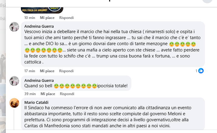 Nel dibattito online, numerosi commenti criticano duramente le politiche di accoglienza, mettendo in discussione il ruolo di Caritas, associazioni e istituzioni ecclesiastiche. Le accuse spaziano dalla presunta mancanza di trasparenza nella gestione dei fondi fino a contestazioni più generiche sul sistema dell’integrazione. Accanto a posizioni critiche, emergono anche richieste di maggiore chiarezza e controlli sull’utilizzo delle risorse pubbliche, ma il confronto si è rapidamente trasformato in una sequenza di messaggi aggressivi, con invettive personali rivolte sia al vescovo sia agli amministratori locali.