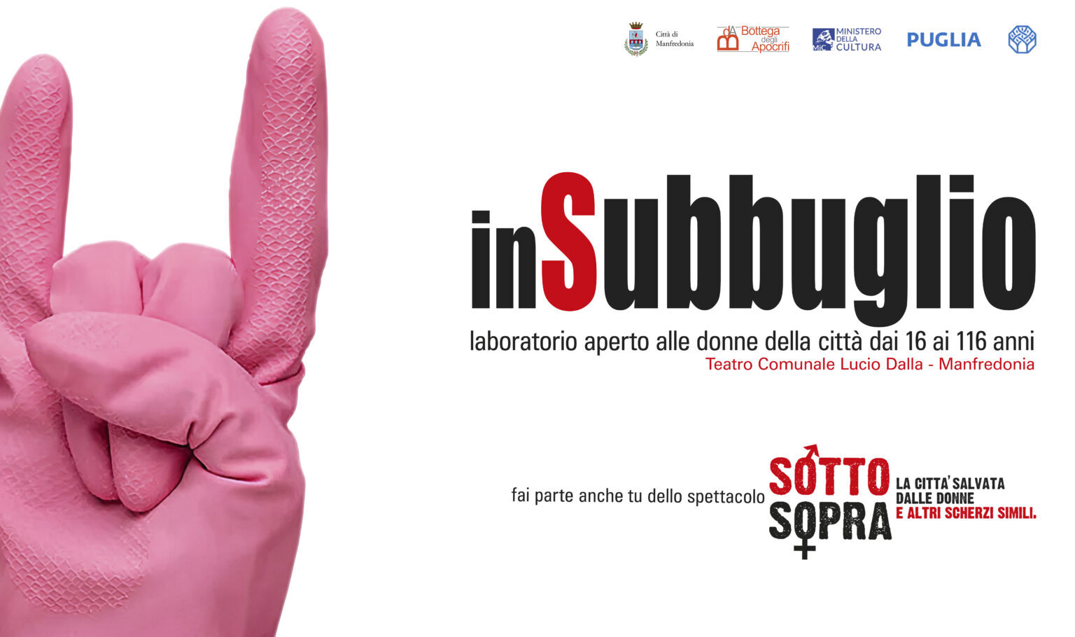 MANFREDONIA – “inSUBBUGLIO“. Arriva come la primavera, come un augurio di risveglio in una città pacificata dalla distrazione questa convocazione della Bottega degli Apocrifi alle cittadine di Manfredonia e della Capitanata tutta, che abbiano dai 16 ai 116 anni e il desiderio di mettersi in gioco in un laboratorio teatrale e coreutico gratuito, che porterà al riallestimento dello spettacolo “SottoSopra. La città salvata dalle donne e altri scherzi simili“, in scena ad aprile nella stagione di prosa “respIRA” del Teatro Comunale “Lucio Dalla”.