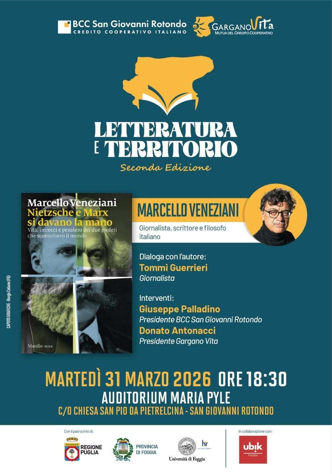 Marcello Veneziani presenterà, domani, martedì 31 Marzo con inizio alle ore 18.30, il suo ultimo libro intitolato: “Nietzsche e Marx si davano la mano”, un’opera che esplora la vita, gli intrecci ed il pensiero di due “giganti” che hanno segnato in maniera indelebile la storia moderna: Friedrich Nietzsche e Karl Marx, e che l’autore definisce “due profeti che sconvolsero il mondo”.