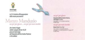 Torna Matteo Manduzio con una mostra intitolata “un pò per gioco…un pò per non morire” ancora una volta divisa in due: una parte nella Sala Grigia del Palazzetto dell’Arte A. Pazienza, l’altra nel Museo Civico di Foggia. L’artista ormai “specializzato” in un’arte tutta particolare e riconoscibilissima, quella del dar vita ed anima a frustoli di vecchi tomi si volta al passato recuperando modi e stili di tanti anni fa. L’evento sarà inaugurato sabato 3 giugno alle ore 18,30 presso il Palazzetto dell’Arte in via Galliani e resterà visitabile fino al 19 giugno, con ingresso gratuito (gli orari sono riportati nella locandina in basso).