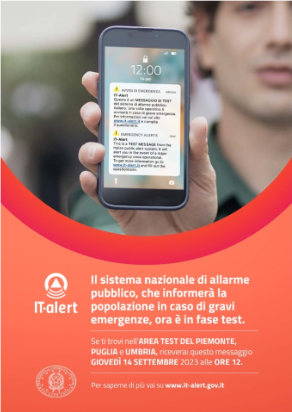Si tratta di un test del dispositivo di emergenza it-alert, che, grazie anche al test di giovedì prossimo, verrà perfezionato per far sì che tutti gli utenti possano usufruire di questo servizio di informazione d’emergenza, in sei casi di competenza della Protezione Civile: maremoto (generato da un terremoto), collasso di una grande diga, attività vulcanica (per i vulcani Vesuvio, Campi Flegrei, Vulcano e Stromboli), incidenti nucleari o emergenze radiologiche, incidenti rilevanti in stabilimenti industriali o precipitazioni intense.