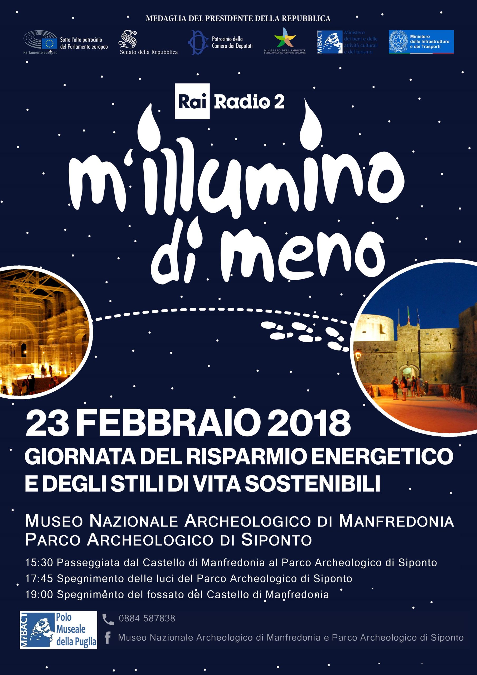 Il Museo Nazionale Archeologico di Manfredonia e il Parco archeologico Santa Maria di Siponto in occasione della 14esima Giornata del Risparmio Energetico promossa anche dal MiBACT, aderiscono all’iniziativa “M’illumino di meno”, la grande campagna radiofonica ideata da Caterpillar, storico programma di Rai Radio 2, per sensibilizzare all’uso razionale dei consumi energetici. Un’iniziativa simbolica e concreta: spegnere le luci nelle piazze italiane, nei monumenti, in tante case e camminare tanto testimoniando il proprio interesse al futuro dell’umanità.