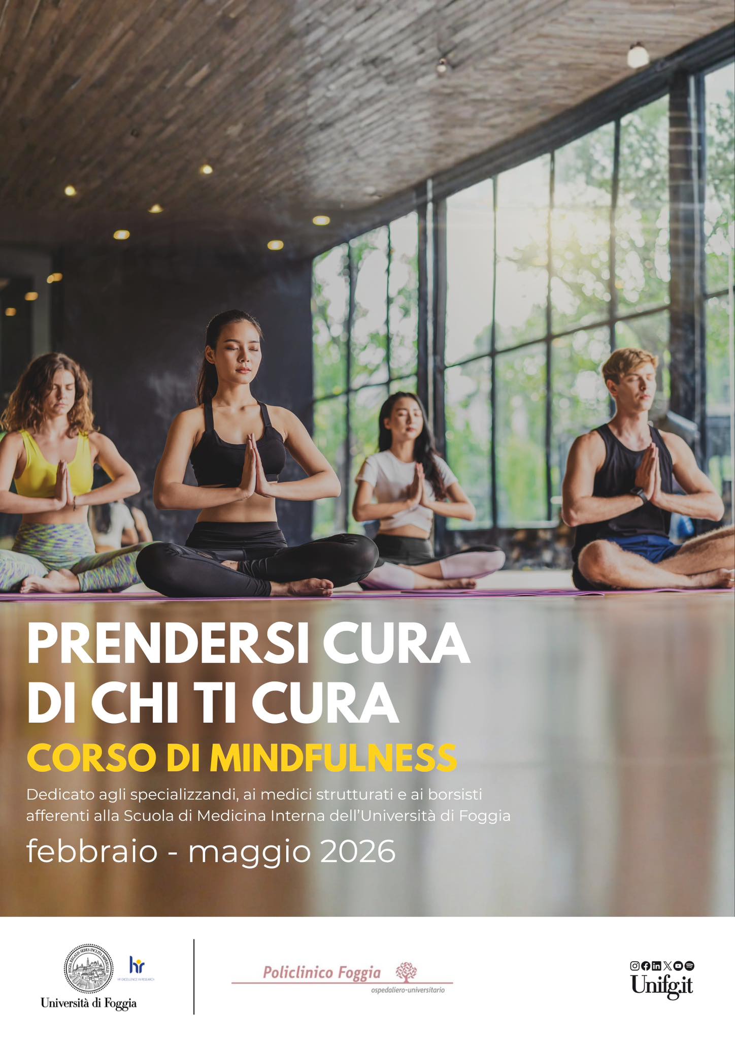 Prenderà avvio domani, 25 febbraio 2026 alle ore 18,00, presso la palestra della Medicina Fisica e Riabilitativa del Policlinico di Foggia (Via Napoli, Palazzo di vetro, piano -1), un corso strutturato di Mindfulness della durata di dodici settimane, rivolto agli specializzandi, ai medici strutturati e ai borsisti afferenti alla Scuola di Medicina Interna dell’Università di Foggia.